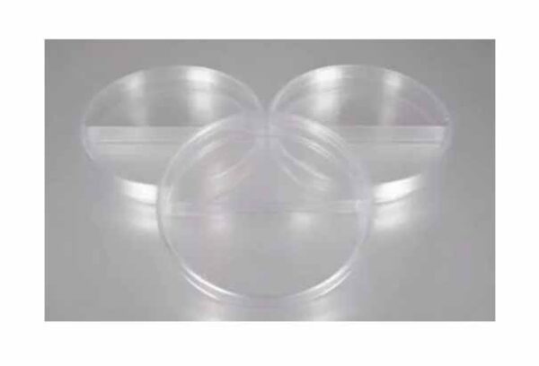 Recipiente de 94 x 15mm de doble compartimento, de uso microbiológico de forma circular de plástico cristalino, consta de dos placas una que funciona de tapa y otra de base. Diseñada para evitar la condensación al llenado y manejarse fácilmente, proveen una sujeción estable para apilarlas sin riesgo.