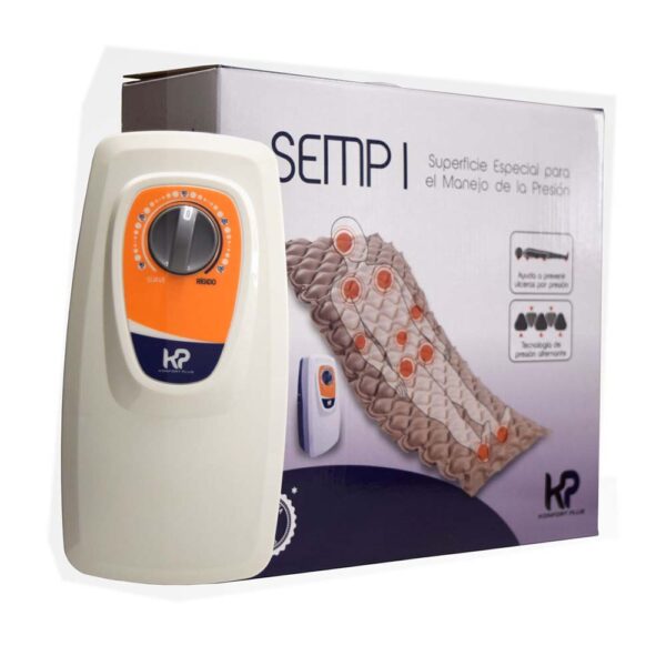 - Compresor compacto, silencioso y de fácil uso, el cual cuenta con un sensor de presión que regula el flujo de aire ajustándolo con el peso del paciente para realizar una efectiva distribución en todas las celdas de la superficie.