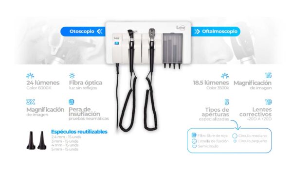 El kit de pared lenz cuenta con un oftalmoscopio y otoscopio con tecnología alemana y tecnología LED mejorada. Con un otoscopio de fibra óptica, con diseño ligero, alto rendimiento y una fuente de luz sintonizable. Un Oftalmoscopio directo, diseño ligero y fácil de operar, libre de sombras y con una fuente de luz sintonizable.