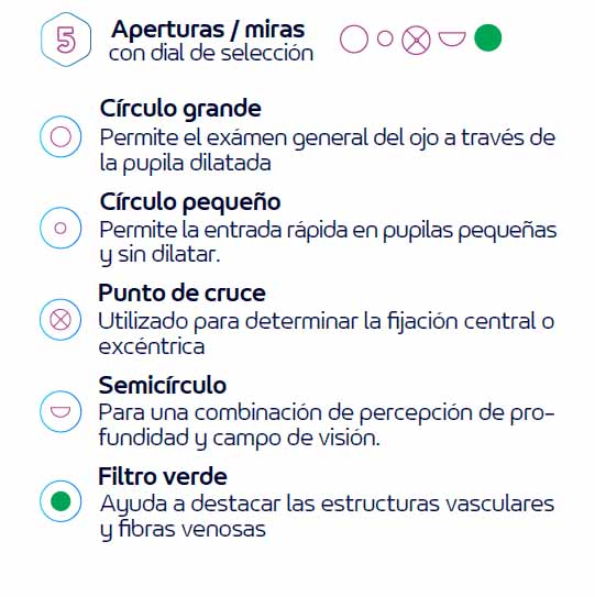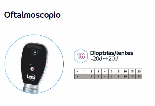 Un otoscopio de fibra óptica, una fuente de luz y un juego de espéculos de distinto diámetro. Un lente magnificador que optimiza la visibilidad del tímpano y conducto auditivo. Un oftalmoscopio con varios lentes y espejos, que luminan el interior del ojo a través de la pupila y el cristalino.